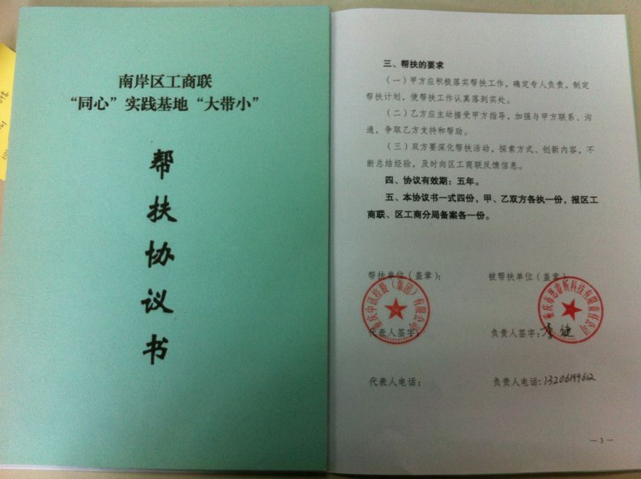 為認(rèn)真貫徹落實(shí)“同心”思想,引導(dǎo)幫扶微小企業(yè)健康發(fā)展。中訊控股集團(tuán)在南岸區(qū)工商聯(lián)的見證下于2012年5月與重慶市長靚光電科技有限公司、重慶市恩睿斯科技有限公司等4家微小企業(yè)簽訂幫扶協(xié)議。